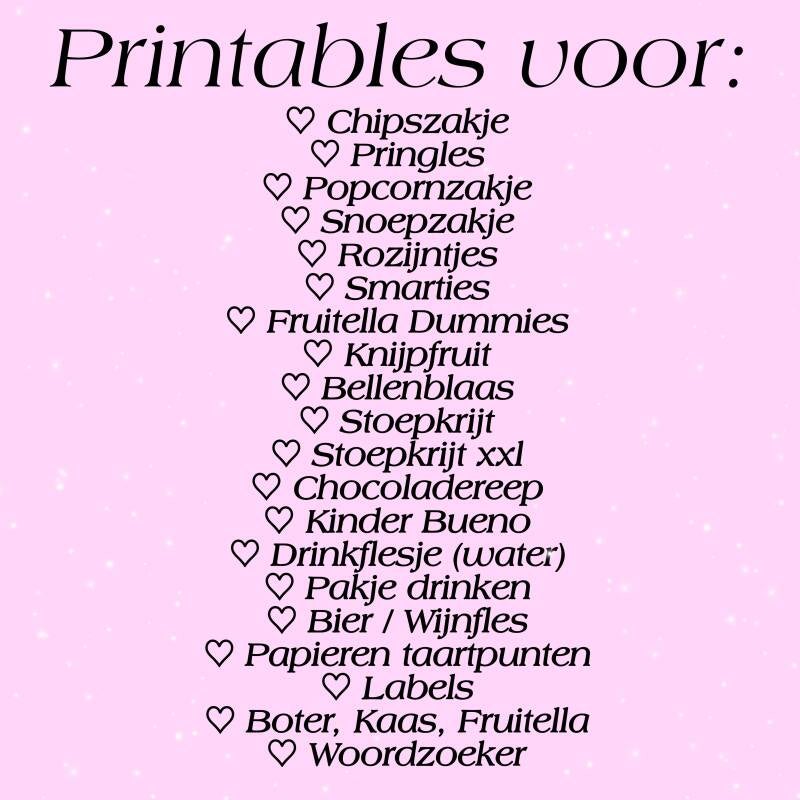 U geeft uw wensen door, en ik ga aan de slag ! Hierdoor zijn letterlijk ALLE thema's mogelijk ! Maar ook kleurgebruik, tekst en plaatjes zijn door uzelf te kiezen. Op dit moment zijn printables mogelijk voor de producten hiernaast op de lijst. Mocht uw product er niet tussen staan ? Stuur me dan gerust een berichtje via een van mijn socials, dan kijk ik wat ik voor u kan betekenen !